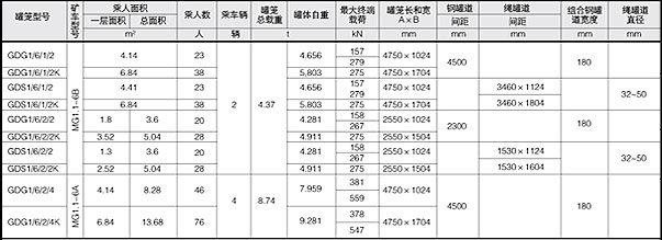 ***大載荷(t) | 罐籠質量(t) | 鋼繩終端質量(t) | 首繩 直徑(mm) | 尾繩 尺寸(mm) | 罐籠 總高(mm) | 鋼性罐道外形尺寸(mm) | 鋼繩罐道(mm) | 乘人數 | ||||||