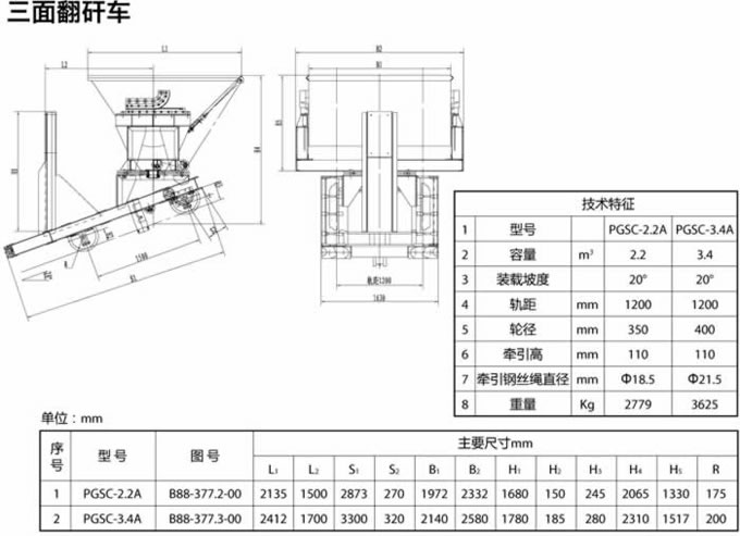 三面翻矸車用途: 排矸系統(tǒng)設(shè)備適用于矸石山裝卸矸石用。其生產(chǎn)工序?yàn)椋褐剀嚦鼍呻姍C(jī)車推至翻車機(jī)車間,通過(guò)裝載扇形閘門卸入裝載設(shè)備,由絞車牽引至卸矸架卸矸,卸矸完成后絞車反轉(zhuǎn),裝載設(shè)備行至裝載扇形閘門下部等待下一工序。
